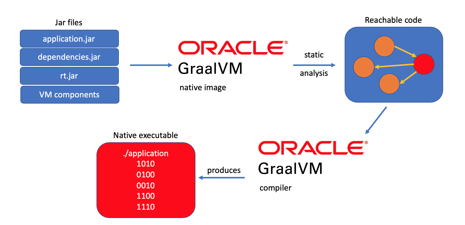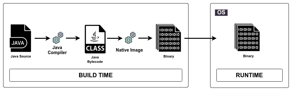 Un exécutable natif est créé par le générateur d'Image Native ou native-image, qui traite les classes de votre application et d'autres métadonnées pour créer un binaire pour un système d'exploitation et une architecture spécifiques. Tout d'abord, l'outil native-image effectue une analyse statique de votre code pour déterminer les classes et méthodes accessibles lorsque votre application s'exécute. Ensuite, il compile les classes, les méthodes et les ressources en un binaire. Ce processus entier est appelé temps de construction pour le distinguer clairement de la compilation du code source Java en bytecode.